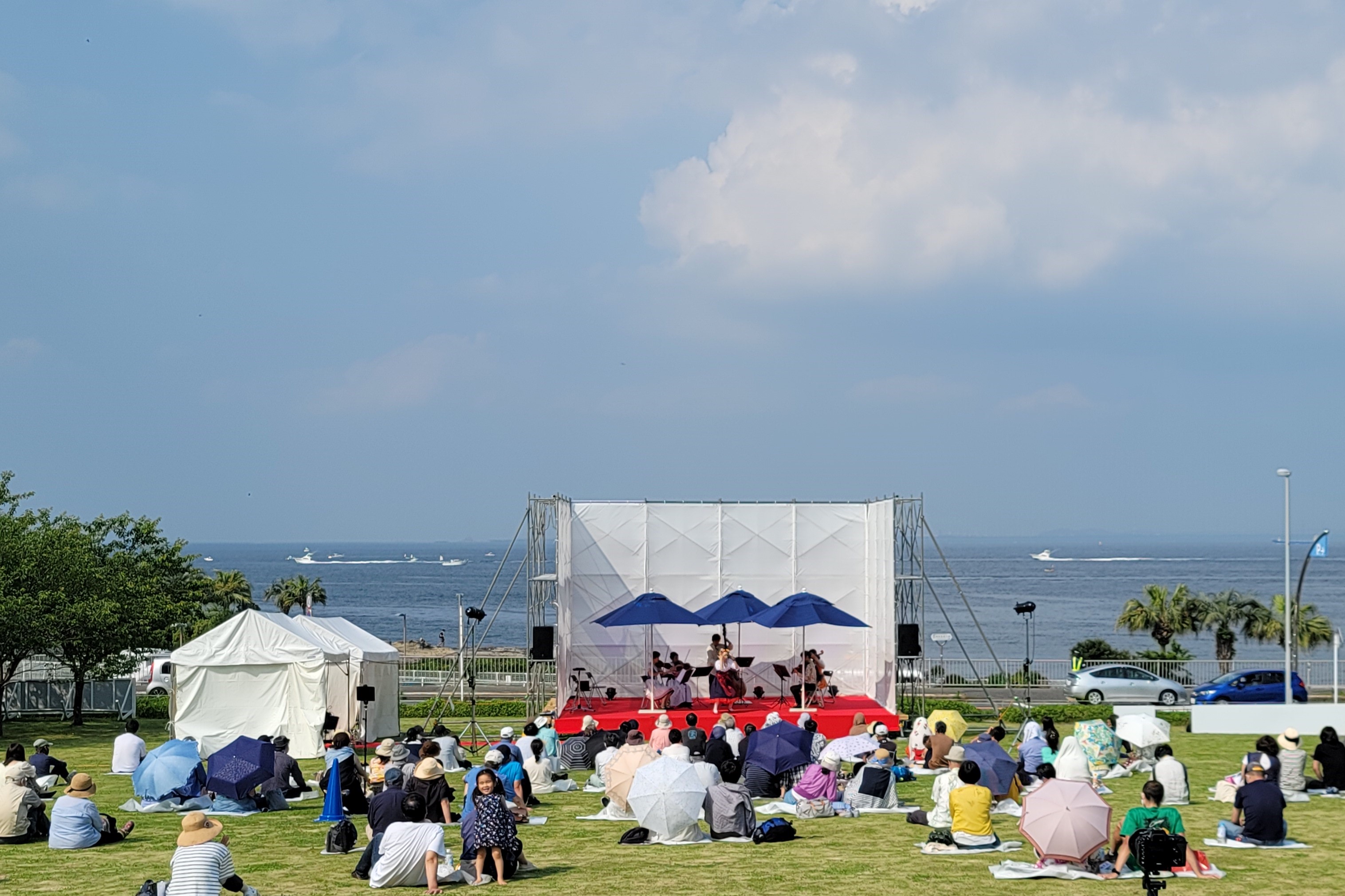 海の広場に大きなスクリーンを設置しての「夏の野外シネマパーティー」をはじめ、3つの屋外広場を利用しての大規模なイベントを開催しています。令和3年度には、谷内六郎展の関連事業として、広場を利用した「アート縁日」も開催しました。また、広場や館内の空間を利用してのコンサート事業なども行っています。
