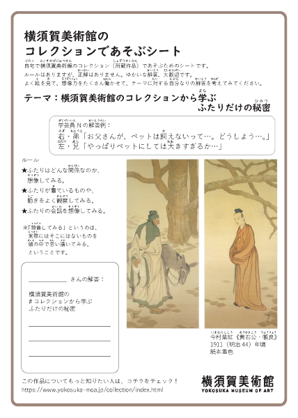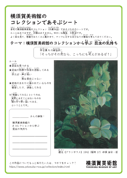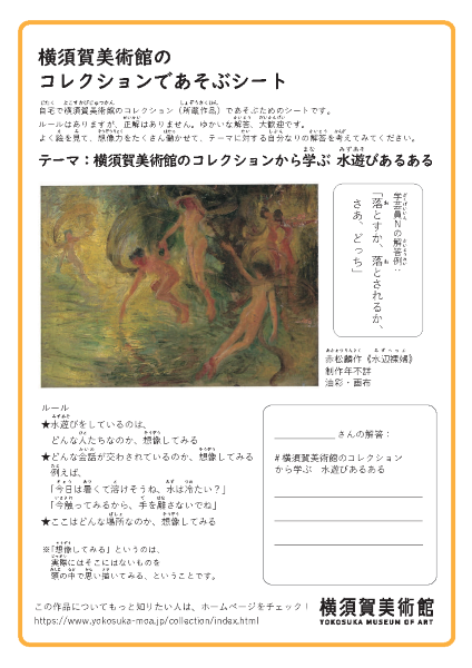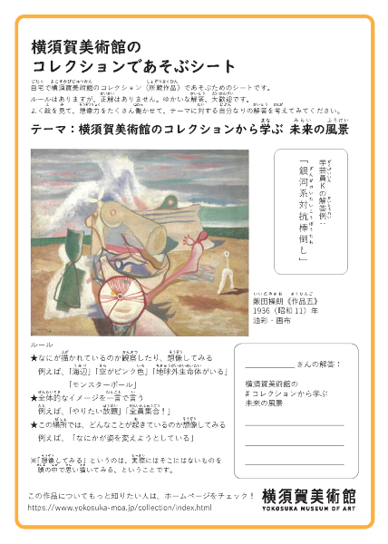 自宅で横須賀美術館のコレクション(所蔵作品)であそぶためのシートです。ルールはありますが、正解はありません。ゆかいな解答、大歓迎です。 シートをダウンロードしたら、よく絵を見ながら、想像力を働かせて、 テーマに対する、自分なりの解答を考えてみてください。A4サイズのPDFがご覧になれます。