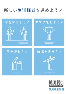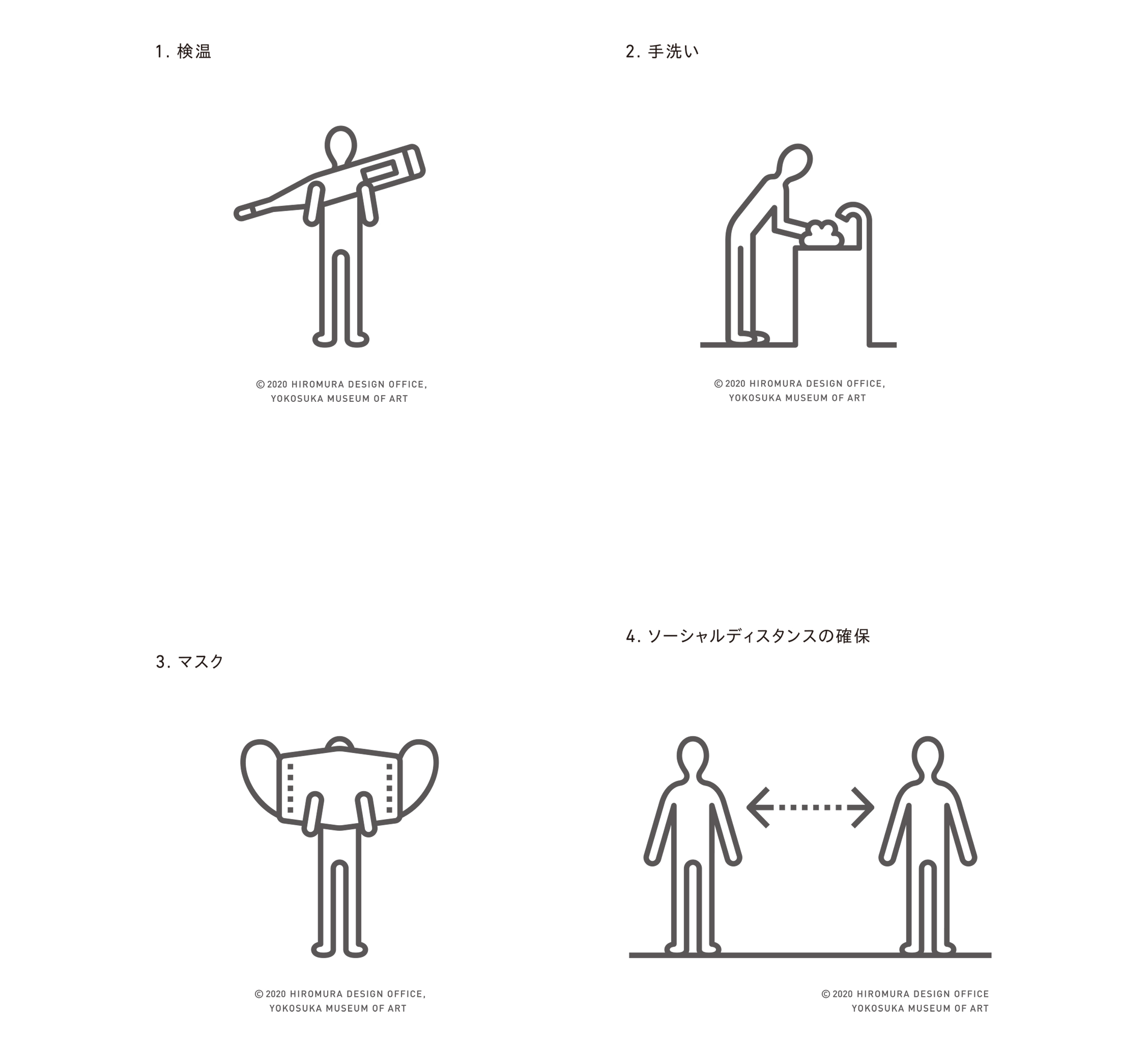 グラフィックデザイナー 廣村正彰氏がデザインした 横須賀美術館オリジナルピクトグラム「よこすかくん」ピクトの 新型コロナウイルス感染予防バージョン(4種類)がダウンロードできます。