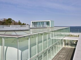 山本理顕設計工場の設計による建物は、ガラスと鉄板の入れ子構造からなるファサードが特徴的です。単純ながら美しいガラスの箱の中に展示室と収蔵庫を配置し、高さを抑えることにより景観との調和にも配慮しています。前面にはワークショップ室やレストランが入る別棟を付け加え、広場と一体化して開放的に楽しめる空間も設けました。美術を中心にさまざまな文化が楽しめる美術館活動を展開しています。