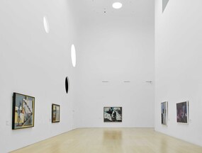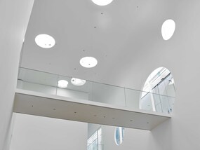 エントランスホールや吹抜の地階所蔵品展示ギャラリーでは、鉄板の天井や壁に丸穴を開けることで、光の分量や熱、視線をコントロールしています。
